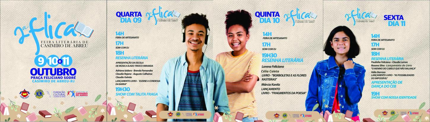 A FLICA (Feira Literária de Casimiro de Abreu) acontece nos dias 9,10 e 11 de outubro. Segue toda a programação, pra quem perdeu a do dia 9.